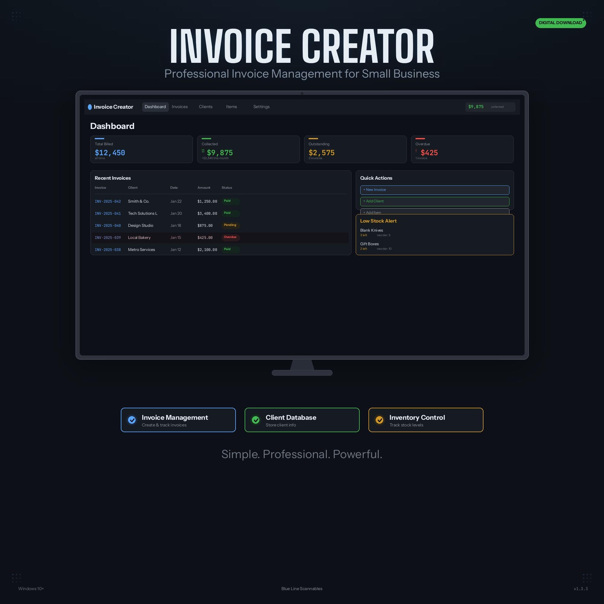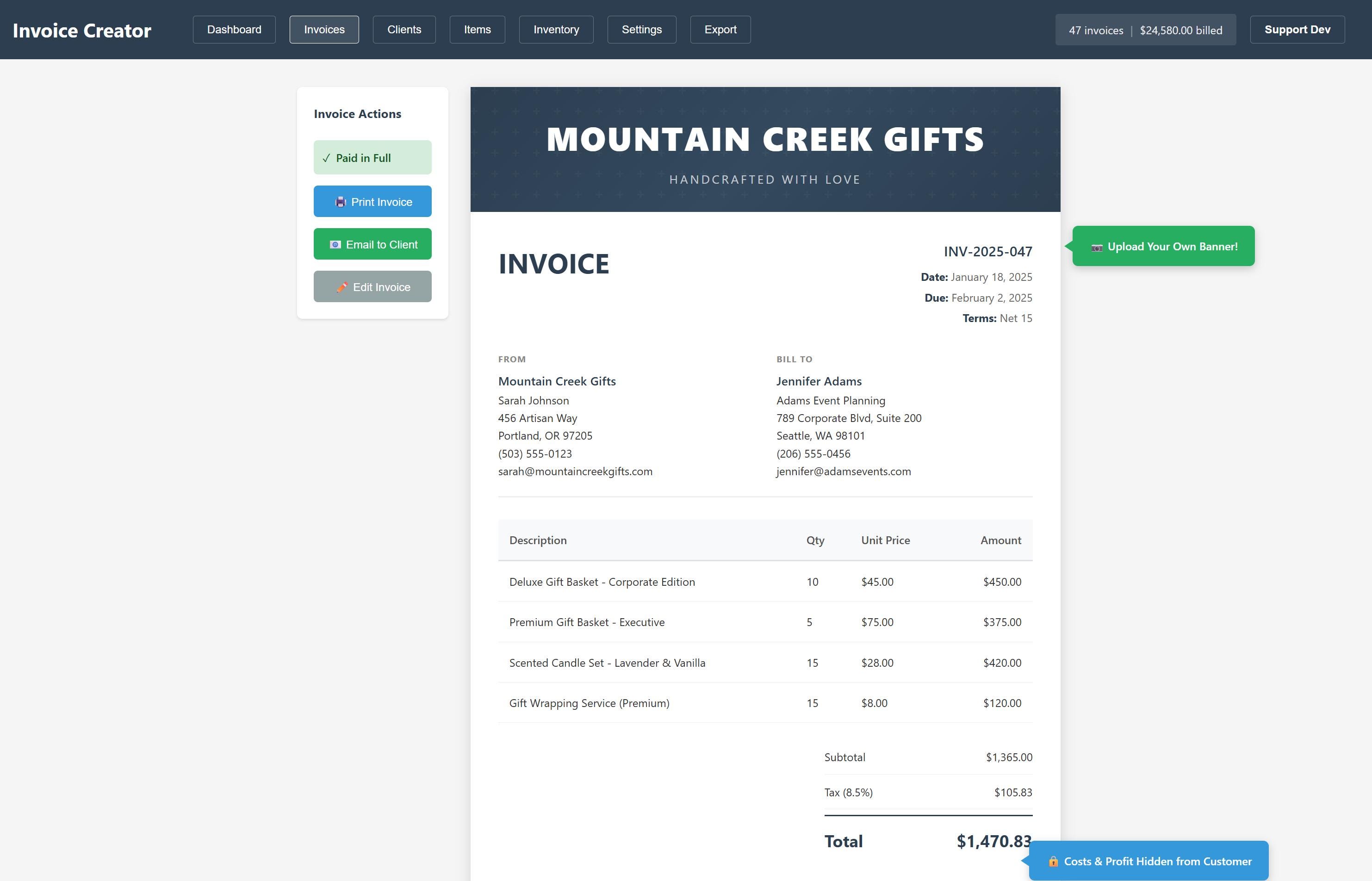• Upload your logo/banner • Custom invoice numbers (INV-2025-001) • Your business info on every invoice • Professional PDF output