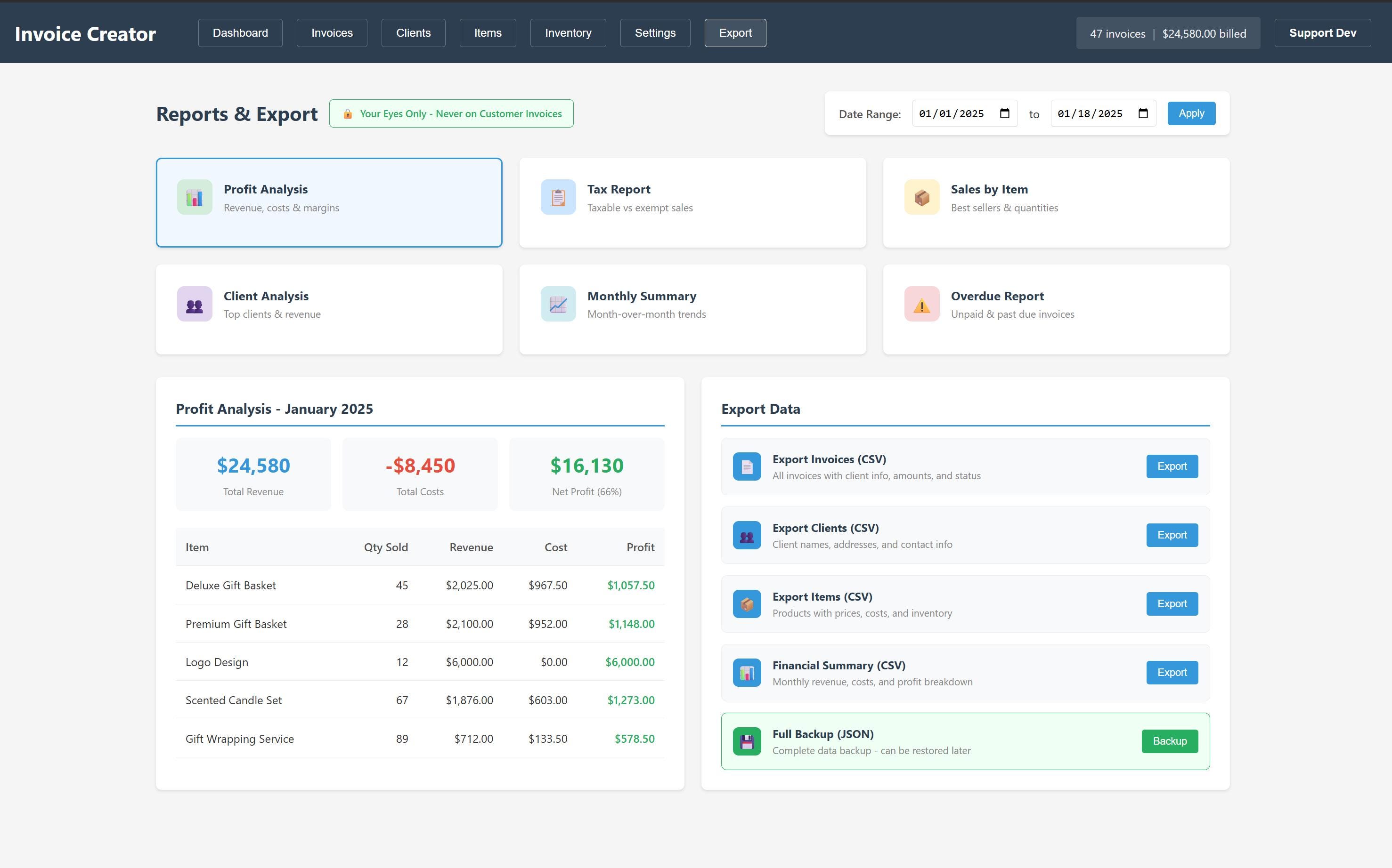 • Profit Analysis • Inventory Value • Client Revenue Summary • Tax Report • Sales by Item
