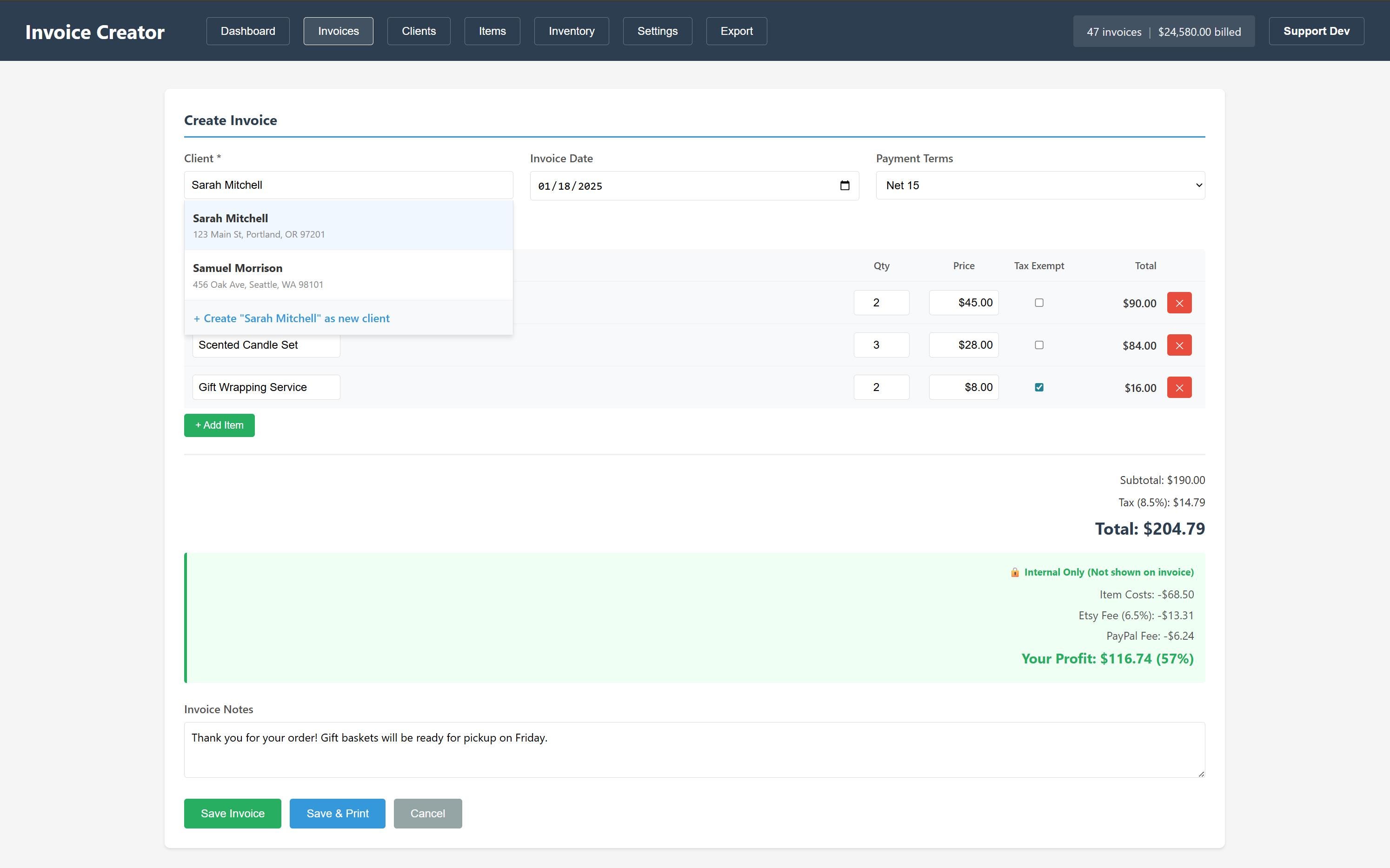 • Client names → full address, phone, email • Item names → price, cost, current inventory • No more retyping. No more copy-paste.