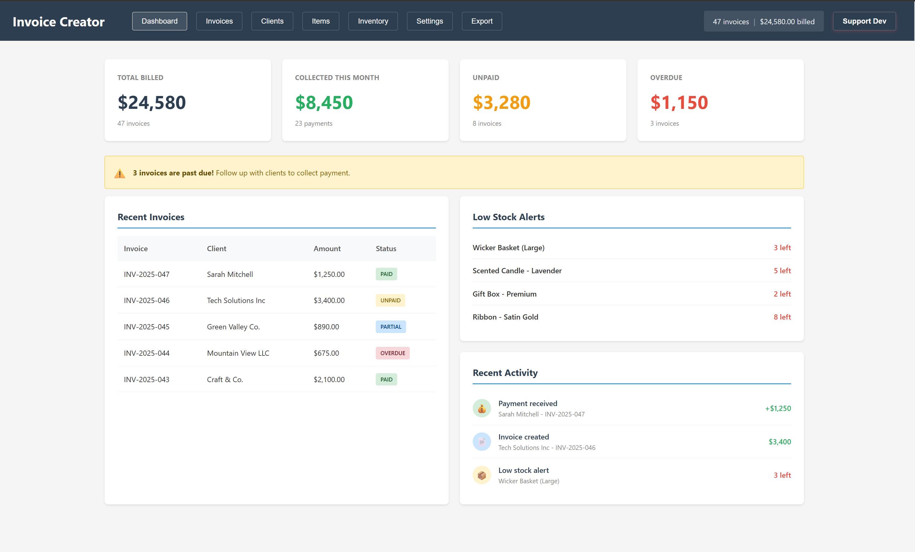 • Unpaid / Partial / Paid / Voided status • Payment terms: Due on Receipt, Net 15, Net 30, Net 60 • Overdue invoices highlighted in red • Dashboard shows exactly who owes you money