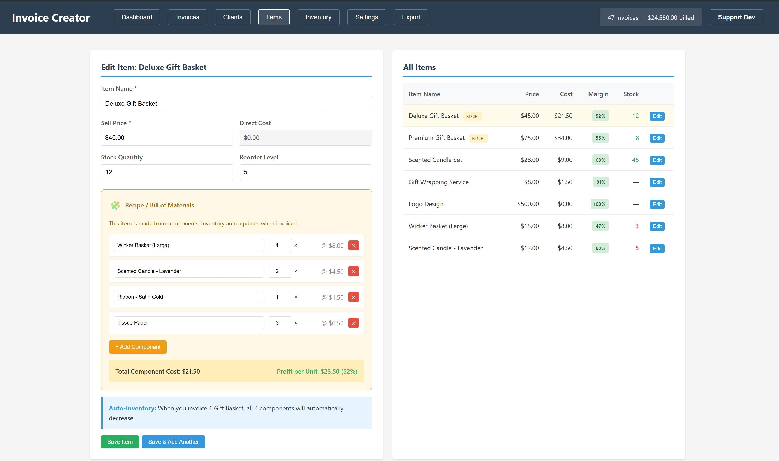 Set up the recipe ONCE. When you invoice a Gift Basket: → All component inventory updates automatically → Your true cost is calculated → You see your REAL profit