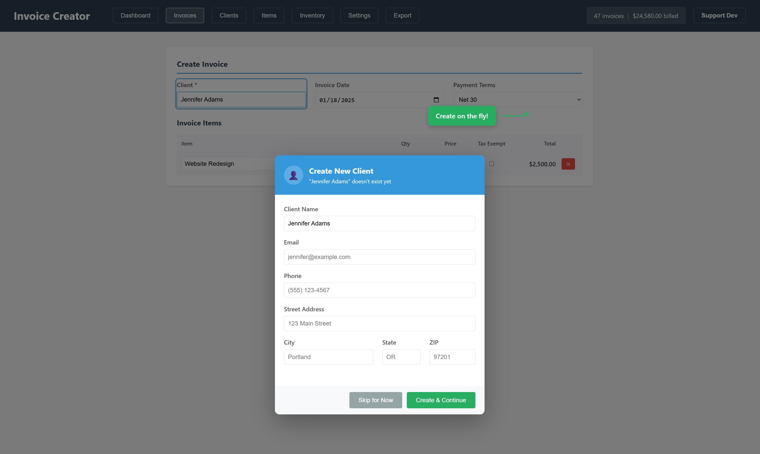 Typing a new client name? A popup asks: "Create new client?" Fill in their info WITHOUT leaving the invoice.